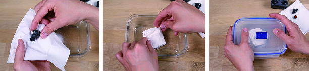 步驟 2:接下來,將一湯匙的鹽倒入一個小型可密封的容器內,或者你也可以用密封保鮮袋,將入耳式耳機用手帕包裹起來,直接放在鹽上。防止耳機外殼與鹽直接接觸。務必避免鹽直接接觸到耳機上,接著關上容器,讓鹽只吸收耳機上的水份,而非環境下的空氣。